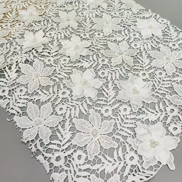 Tecido floral de renda floral Pérolas de gipas de água de bordado de corda solioso de bordado Criados usando técnicas de bordado de cordão solúvel em água, o design mostra padrões precisos e parecidos com rendas com uma qualidade escultural. O tecido é ideal para moda de ponta, desgaste de noivas e aplicações decorativas, oferecendo elegância e textura.