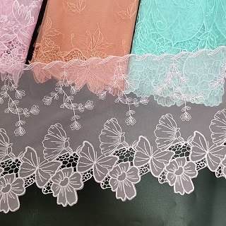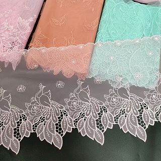 A guarnição de renda de malha bordada é um tipo de renda delicado e intrincado que é frequentemente usado como sotaque decorativo em roupas, acessórios e itens de decoração da casa. Esse tipo de renda é criado por costura ou máquina bordando um padrão em uma fina camada de tecido de malha. O bordado pode assumir várias formas, incluindo desenhos florais, geométricos ou abstratos. O tecido de malha fornece uma qualidade delicada e arejada para a renda, enquanto o bordado adiciona profundidade e textura. A guarnição bordada de renda de malha é comumente usada como um enfeite em roupas como vestidos de noiva, vestidos de noite e lingerie. É também uma escolha popular para adicionar um toque de elegância a itens de decoração de casa, como cortinas, toalhas de mesa e travesseiros decorativos. A guarnição de renda de malha bordada vem em uma variedade de cores e larguras, permitindo uma ampla gama de possibilidades de design. Se você deseja adicionar um toque vintage ou moderno ao seu projeto, a guarnição bordada de renda de malha é uma escolha atemporal e bonita.
