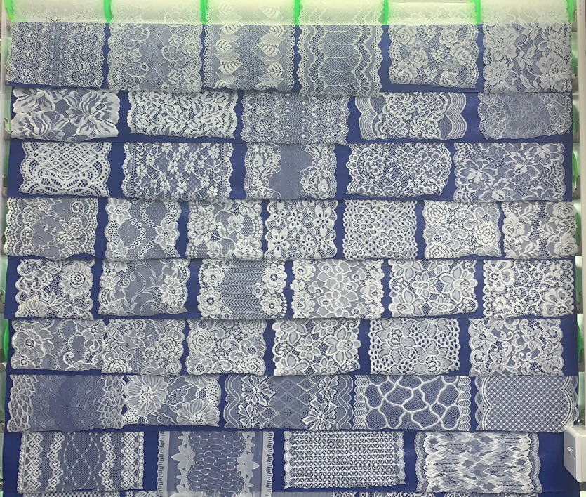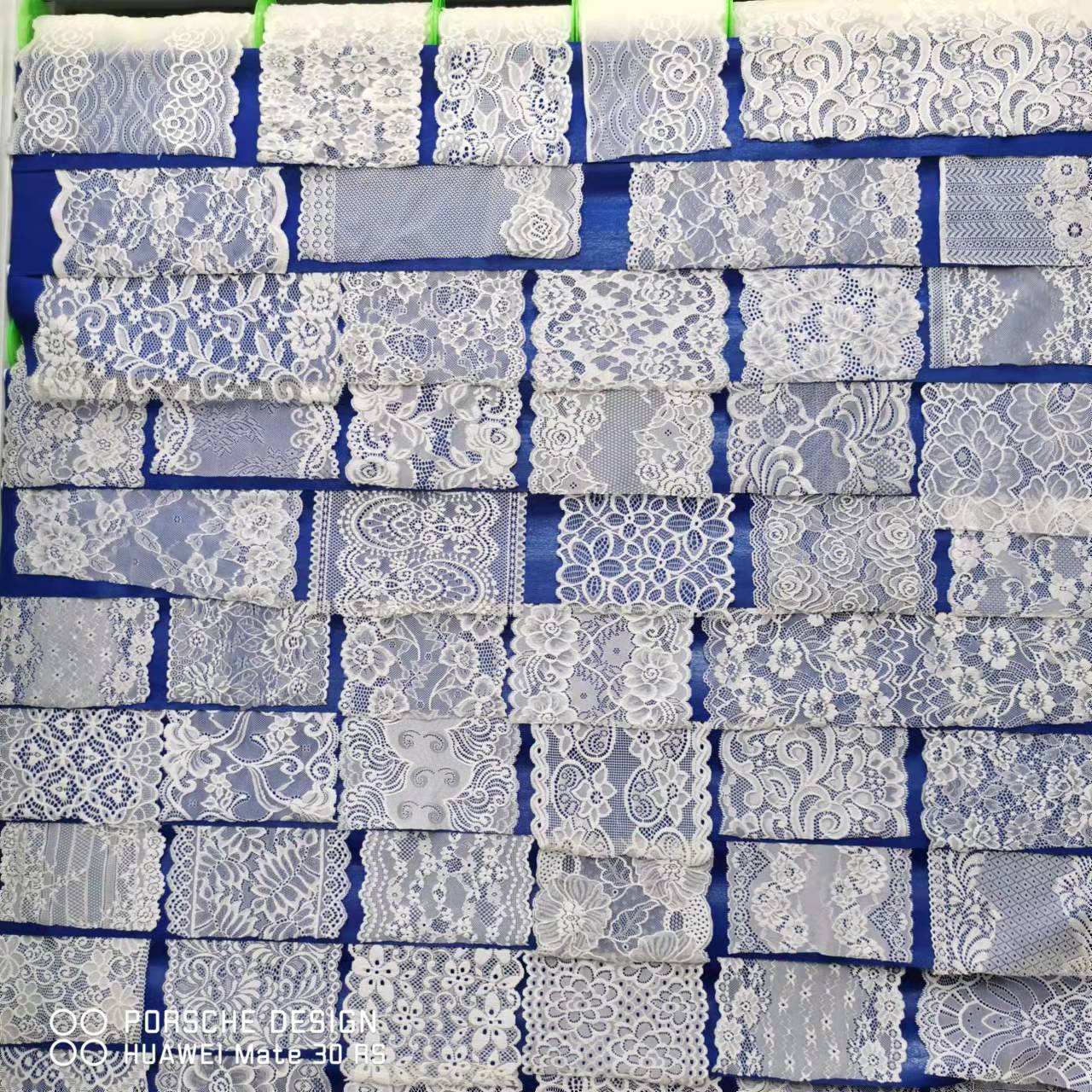 Hot Sale Hot Speak Nylon Spandex Lace Stretch Trim com renda elástica para roupas íntimas e lingerie feita de material de mistura de spandex de nylon de alta elástico, é macio, respirável e tem forte resiliência sem deformação. É adequado para desgaste bem ajustado, como roupas íntimas, shapewear e roupas adultas
