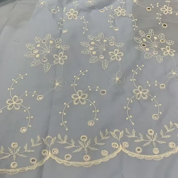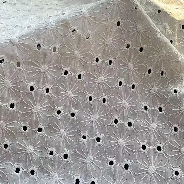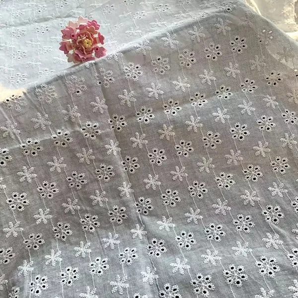 Tecido de bordado de renda de algodão branco para vestir este elegante tecido de renda apresenta bordados delicados e cortes de ilhós, criando um material respirável e leve perfeito para vestidos, blusas e desgaste de noivas. Os intrincados padrões florais e as bordas recortadas adicionam um charme romântico e vintage, enquanto o algodão natural garante suavidade e conforto.
